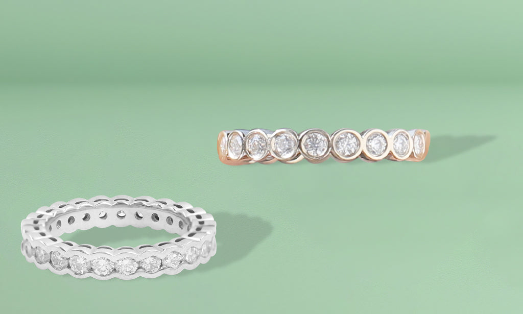 The Bezel Set Band features diamonds securely encased in metal, offering a sleek and modern design. Timeless and elegant, it symbolizes everlasting love and commitment for every special occasion.